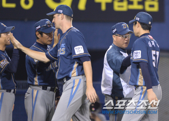 25일 잠실구장에서 프로야구 LG와 NC의 주중 3연전 두 번째 경기가 열렸다. NC가 LG에 3대1로 승리했다. 경기 종료 후 NC 김경문 감독이 승리투수 이재학(오른쪽)과 하이파이브를 나누고 있다. 잠실=송정헌 기자 songs@sportschosun.com/2014.06.25