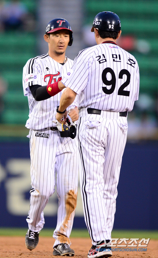 26일 잠실구장에서 프로야구 LG와 NC의 주중 3연전 마지막 경기가 열렸다. NC는 시리즈 2승으로 스윕에 도전한다. LG 손주인이 5회 1사 2루에서 1타점 2루타를 날렸다. 2루에서 김민호 코치와 하이파이브를 나누고 있는 손주인. 잠실=송정헌 기자 songs@sportschosun.com/2014.06.26