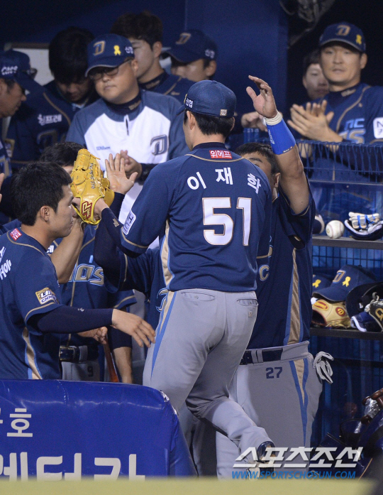 25일 잠실구장에서 프로야구 LG와 NC의 주중 3연전 두 번째 경기가 열렸다. NC는 전날 선발 찰리의 '노히트 노런' 경기로 LG에 6대0 승리했다. NC 선발 이재학이 7회 1사에서 마운드를 내려왔다. 이재학은 6.1이닝 1실점 호투를 펼쳤다. 덕아웃에서 동료들과 하이파이브를 나누고 있는 이재학. 잠실=송정헌 기자 songs@sportschosun.com