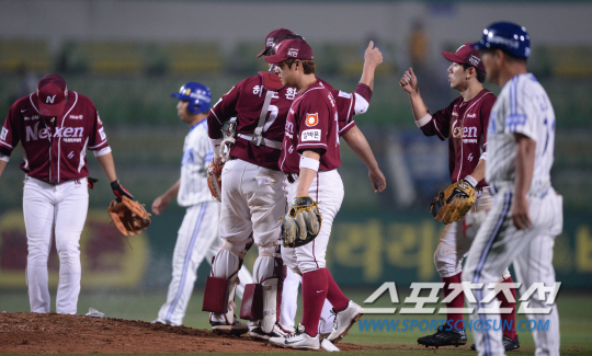 24일 오후 대구 시민야구장에서 2014 프로야구 넥센과 삼성의 경기가 열렸다. 6대5로 승리하며 4연승을 이어간 넥센 선수들이 하이파이브를 나누고 있다. 대구=김경민 기자 kyungmin@sportschosun.com / 2014.06.24.