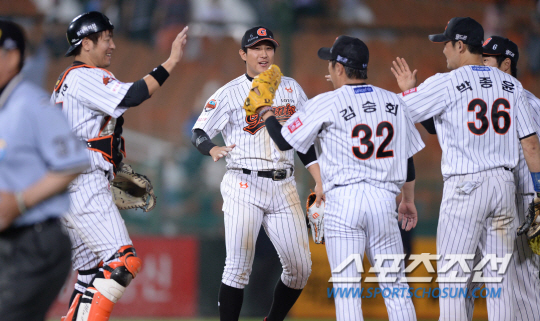 | 27일 오후 부산 사직구장에서 2014 프로야구 롯데와 NC의 경기가 열렸다. 8대7로 승리한 롯데 선수들이 마운드 위에서 하이파이브를 나누고 있다. 부산=김경민 기자 kyungmin@sportschosun.com |