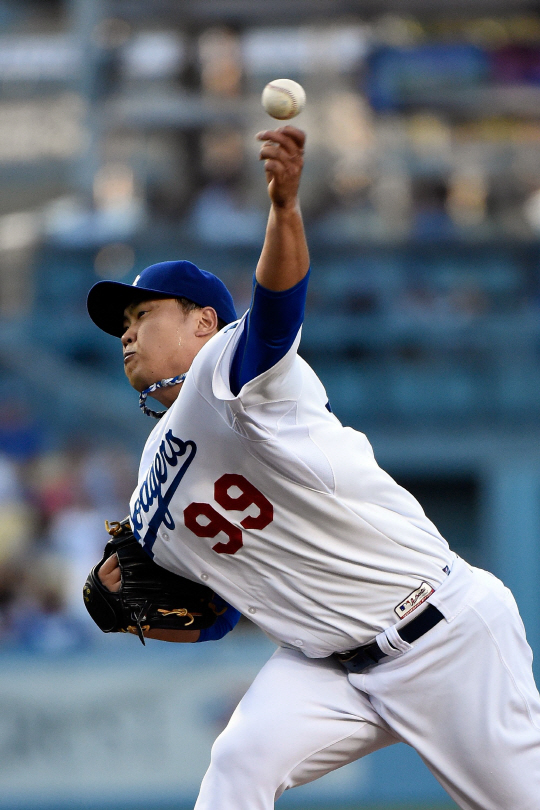 | LA 다저스 류현진이 28일(한국시각) 다저스타디움에서 열린 세인트루이스 카디널스전에서 힘차게 공을 던지고 있다. 이날 류현진은 7이닝 3실점으로 호투했지만 패전을 안았다. ⓒAFPBBNews = News1 |