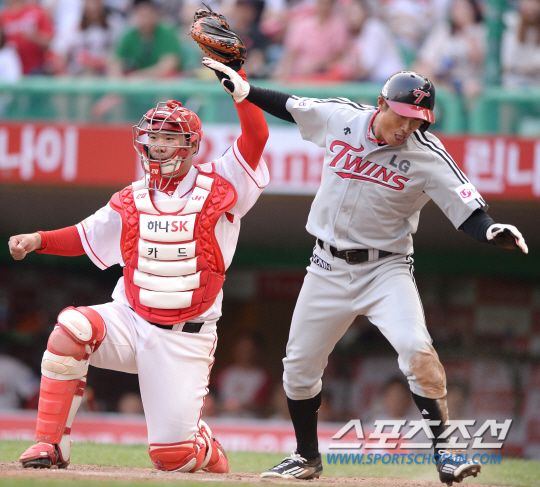 | 29일 인천 문학구장에서 프로야구 SK와 LG의 주말 3연전 마지막 경기가 열렸다. SK는 LG에 시리즈 2승으로 스윕에 도전한다. LG 5회 1사 1,2루에서 이병규의 2루타 때 2루주자 임재철이 득점에 성공했다. 홈에서 태그를 피해 세이프되고 있는 임재철. 인천=송정헌 기자 songs@sportschosun.com/2014.06.29 |