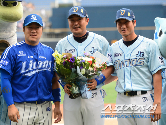삼성 라이온즈와 NC 다이노스의 2014 프로야구 경기가 22일 마산구장에서 열렸다. 경기 전 NC 이호준이 개인통산 1000타점 기록에 대한 시상식이 열렸다. 삼성 최형우와 NC 이현곤이 축하 꽃다발을 건네고 있다. 이호준은 1996년 5월 15일 광주 무등야구장에서 열린 OB베어스와 해태 타이거즈 경기에서 첫 타점을 올린 후 2014년 6월 17일 마산 롯데와의 경기에서 1000타점을 기록했다. 역대 11번째 기록이다. 마산=정재근 기자 cjg@sportschosun.com/2014.06.22/