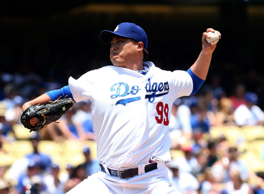 | LA 다저스 류현진이 3일(한국시각) 클리블랜드 인디언스전에서 힘차게 공을 던지고 있다. ⓒAFPBBNews = News1 |