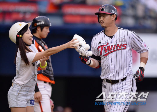 3일 오후 서울 잠실야구장에서 2014 프로야구 한화와 LG의 경기가 열렸다. 1회말 2사서 LG 박용택이 좌중월 솔로홈런을 친 후 배트걸에게서 인형을 받아들고 있다. 잠실=김경민 기자 kyungmin@sportschosun.com