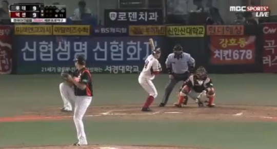 이게 서건창의 타격폼이다. 독특하다. 방망이를 최대한 자기 몸쪽으로 붙이고 있다가 빠르게 감아돌인다. 방망이 스피드를 극대화시킨 자세로 보인다. 화면캡처=MBC스포츠+