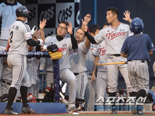 5일 창원 마산구장에서 프로야구 NC와 LG의 주말 3연전 두 번째 경기가 열렸다. LG는 전날 NC에 6대3으로 승리하며 5연승을 기록중이다. 4회 LG 오지환이 박용택의 적시타 때 득점에 성공했다. 덕아웃에서 동료들과 하이파이브를 나누고 있는 오지환. 창원=송정헌 기자 songs@sportschosun.com/2014.07.05