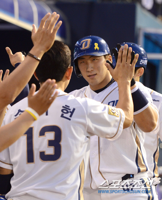 4일 창원 마산구장에서 프로야구 NC와 LG의 경기가 열렸다. NC 나성범이 4회 1사 2루에서 LG 류제국을 상대로 투런포를 날렸다. 덕아웃에서 동료들과 하이파이브를 나누고 있는 나성범. 창원=송정헌 기자 songs@sportschosun.com/2014.07.04