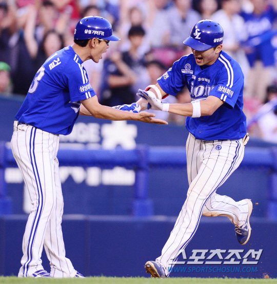 2014 프로야구 두산과 삼성의 경기가 6일 잠실 야구장에서 펼쳐 졌다. 삼성 6회초 2사 1루에서 박해민이 우중월 투런 홈런을 날리고 김재걸 코치와 하이파이브를 하고 있다. 박해민의 데뷔 첫 홈런이다. 잠실=조병관기자 rainmaker@sportschosun.com