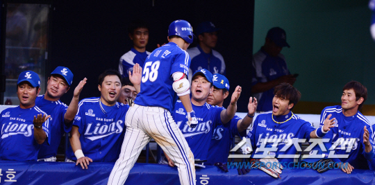 2014 프로야구 두산과 삼성의 경기가 6일 잠실 야구장에서 펼쳐 졌다. 삼성 6회초 2사 1루에서 박해민이 우중월 투런 홈런을 날리고 동료들의 축하를 받고 있다. 박해민의 데뷔 첫 홈런이다. 잠실=조병관기자 rainmaker@sportschosun.com