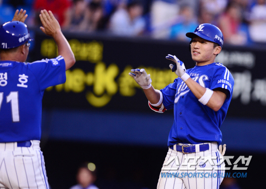 박해민이 2014시즌 올스타전에 출전할 수 있게 됐다. 동군(이스턴) 사령탑인 류중일 삼성 라이온즈 감독이 최근 공수주에서 두루 두각을 나타내고 있는 박해민을 감독 추천 선수 명단(12명)에 포함시켰다. 2014 프로야구 두산과 삼성의 경기가 6일 잠실 야구장에서 펼쳐 졌다. 삼성 6회초 2사 1루에서 박해민이 우중월 투런 홈런을 날리고 김평호 코치의 축하를 받고 있다. 박해민의 데뷔 첫 홈런이다. 잠실=조병관기자 rainmaker@sportschosun.com/2014.07.06/