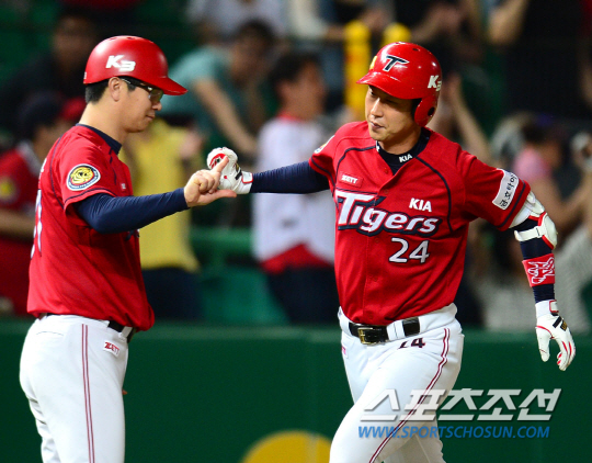 KIA 타이거즈와 SK 와이번스의 주중 3연전 첫 번째 경기가 8일 인천구장에서 열렸다. 9회초 1사 KIA 김다원이 좌월 솔로포를 치고 3루를 돌며 김종국 코치의 축하를 받고 있다. 인천=정재근 기자 cjg@sportschosun.com
