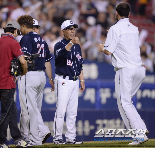 8일 오후 서울 잠실야구장에서 2014 프로야구 두산과 LG의 경기가 열렸다. 14대8로 승리한 후 두산 송일수 감독이 선수들과 주먹을 맞추며 기뻐하고 있다. 잠실=김경민 기자 kyungmin@sportschosun.com