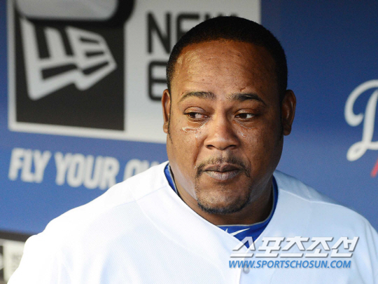 LA 다저스 류현진이 10일(한국시각) 미국 캘리포니아주 로스엔젤레스 다저스타디움에서 디트로이트 타이거즈와의 홈경기를 덕아웃에서 지켜봤다. 안약을 넣은 유리베가 눈물을 흘리고 있다. 이날 훈련에서 불펜피칭을 소화한 류현진은 오는 12일 애리조나 원정경기에 등판할 예정이다. 로스엔젤레스(미국 캘리포니아주)=정재근기자 cjg@sportschosun.com/2014.04.10/