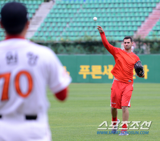 9일 오후 인천 문학구장에서 열릴 2014 프로야구 KIA와의 경기에 앞서 SK 새 용병 밴와트가 김원형 코치와 캐치볼을 하고 있다. 인천=김경민 기자 kyungmin@sportschosun.com / 2014.07.09. |