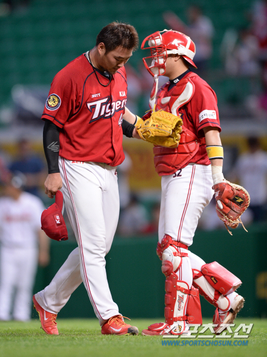 9일 오후 인천 문학구장에서 2014 프로야구 KIA와 SK의 경기가 열렸다. 5회말 2사 1,3루서 KIA 선발투수 김진우가 강판되고 있다. 인천=김경민 기자 kyungmin@sportschosun.com / 2014.07.09.