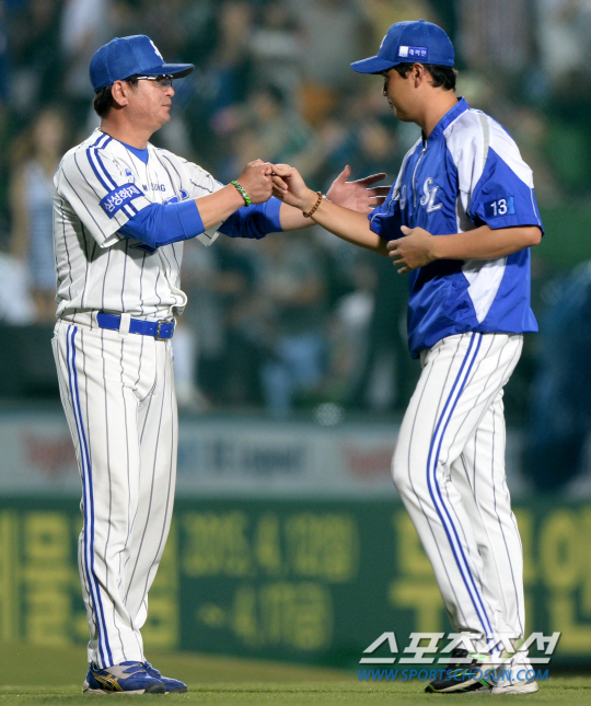류중일 삼성 라이온즈 감독은 선수들 칭찬하기에 바빴다. 삼성과 롯데의 주중 3연전 두번째 경기가 9일 대구구장에서 열렸다. 5대4, 승리로 경기를 마무리한 삼성 선수들이 하이파이브를 하고 있다. 오늘 경기 승리투수가 되며 시즌 9승째를 챙긴 장원삼이 류중일 감독과 기쁨을 나누는 모습. 대구=허상욱 기자 wook@sportschosun.com/2014.07.09/