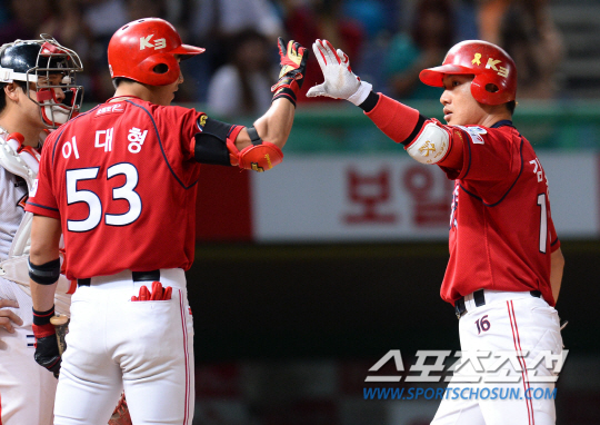 2014 프로야구 SK와이번스와 KIA타이거스의 경기가 10일 인천문학야구장에서 열렸다. KIA 9회초 무사에서 김주찬이 우월 솔로홈런을 치고 이대형과 하이파이브 하고있다. 문학=최문영 기자 deer@sportschosun.com