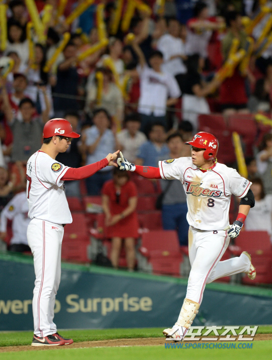 KIA와 롯데의 주말 3연전 첫번째 경기가 11일 광주 기아챔피언스필드에서 열렸다. 8회말 KIA 안치홍이 좌월 솔로홈런을 날린 후 김종국 3루 코치와 하이파이브를 하고 있다. 안치홍은 오늘 경기 두개의 홈런을 기록했다. 광주=허상욱 기자 wook@sportschosun.com
