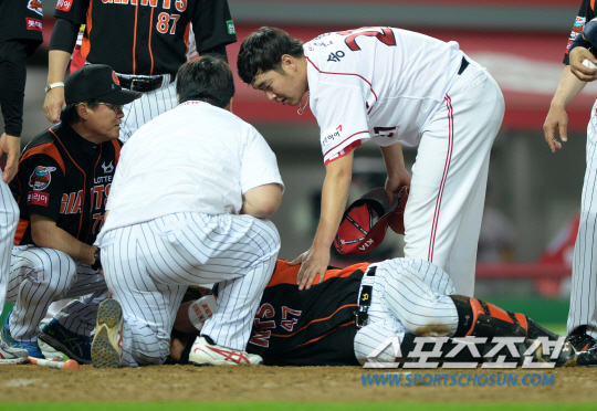 KIA와 롯데의 주말 3연전 두번째 경기가 12일 광주 기아챔피언스필드에서 열렸다. 8회초 1사 1,2루 롯데 강민호가 KIA 송은범의 투구를 머리에 맞았다. 송은범이 헤드샷 퇴장을 당해 마운드를 내려가며 강민호에게 미안함을 표현하고 있다. 광주=허상욱 기자 wook@sportschosun.com/2014.07.12/ |