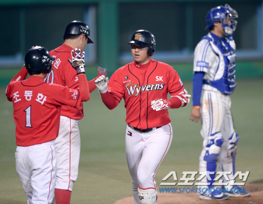 12일 대구시민구장에서 프로야구 삼성과 SK의 주말 3연전 두 번째 경기가 열렸다. 7회 무사 1루에서 SK 최정이 삼성 박근홍을 상대로 좌중월 투런포를 날렸다. 홈에서 동료들과 하이파이브를 나누고 있는 최정. 대구=송정헌 기자 songs@sportschosun.com/2014.04.12