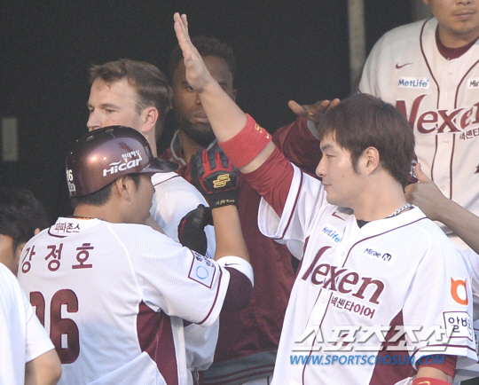 11일 목동구장에서 프로야구 넥센과 NC의 주말 3연전 첫 번째 경기가 열렸다. 넥센 김민성이 4회 1사 2,3루에서 2타점 적시타를 날렸다. 득점에 성공한 강정호가 덕아웃에서 박병호와 하이파이브를 나누고 있다. 목동=송정헌 기자 songs@sportschosun.com/2014.07.11 |