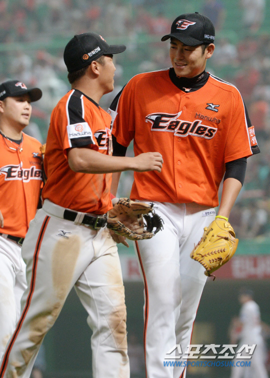 SK와 한화의 경기가 15일 인천 문학구장에서 열렸다. 한화 이태양이 5회말 2사 1,2루 SK 최정을 범타 처리하며 무실점으로 이닝을 마친 후 정근우와 기쁨을 나누고 있다. 인천=허상욱 기자 wook@sportschosun.com