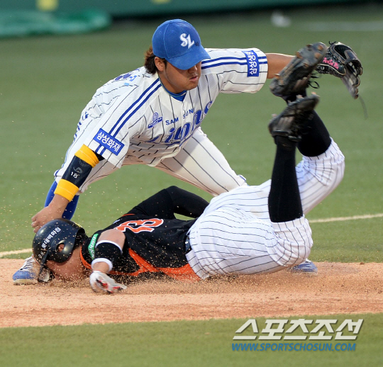 삼성과 롯데의 주중 3연전 마지막 경기가 10일 대구구장에서 열렸다. 3회초 1사 1루 롯데 강민호의 좌전안타때 3루로 뛰던 1루주자 황재균이 슬라이딩을 하다 그라운드 바닥에 얼굴을 부딪히고 있다. 대구=허상욱 기자 wook@sportschosun.com/2014.07.10/ |