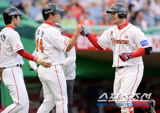 SK와 한화의 경기가 16일 인천 문학구장에서 열렸다. 1회말 1사 1,2루 SK 이재원이 한화 앨버스의 투구를 받아쳐 좌측담장을 넘어가는 역전 3점홈런을 날렸다. 홈인하며 선행주자들과 기쁨을 나누는 이재원. 인천=허상욱 기자 wook@sportschosun.com