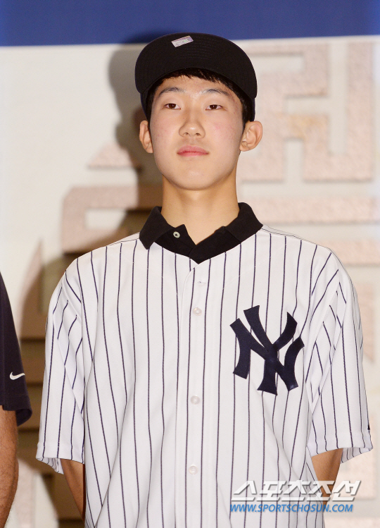 5일 서울 광장동 쉐라톤 그랜드 워커힐 호텔에서 야탑고 유격수 박효준의 뉴욕 양키스 입단식 기자회견이 열렸다. 양키스 유니폼을 입은 박효준이 포즈를 취하고 있다. 한국인 최초로 미국 메이저리그 뉴욕 양키스에 신인 지명된 박효준의 계약금 116만 달러다. 지난달 22일 mlb.com에서 선정한 외국인 유망주 순위에서 13위에 선정된 박효준은 2015년도에 싱글A에서 선수생활을 시작한다. 현재 야탑고 3학년에 재학중인 박효준은 고교 3년 통산 59경기에 나와 181타수 52안타 5홈런 49타점 타율 0.359를 기록했다. 정재근 기자 cjg@sportschosun.com/2014.07.05/