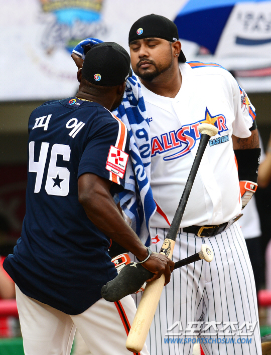 2014 올스타전이 18일 광주챔피언스필드에서 열렸다. 홈런왕 레이스에 참가한 롯데 히메네스가 한화 피에로부터 특급 서비스를 받고 있다. 히메네스의 얼굴을 수건으로 닦아주고 있는 피에. 광주=정재근 기자 cjg@sportschosun.com/2014.07.18/