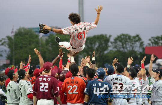2014 올스타전이 18일 광주챔피언스필드에서 열렸다. 경기 전 박찬호의 은퇴식 및 시구행사가 열렸다. 시구를 마친 박찬호를 올스타 선수들이 나와 헹가래치고 있다. 광주=정재근 기자 cjg@sportschosun.com/2014.07.18/