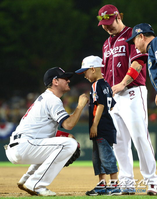 2014 올스타전이 18일 광주챔피언스필드에서 열렸다. 5회 클리닝타임 때 뜻 깊은 행사가 열렸다. 백혈병을 앓고 있지만 야구 선수의 꿈을 키우고 있는 박주상 군(9)이 박병호의 손을 잡고 그라운드에 나와 배트를 휘두르고 1루까지 달려 간 후 선수들과 하이파이브를 하며 꿈과 희망을 선물 받았다. 박병호와 함께 1루로 달려간 박주상 군이 칸투의 애정 듬뿍 담긴 격려를 받고 있다. 광주=정재근 기자 cjg@sportschosun.com