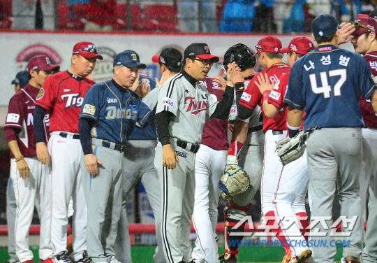 2014 올스타전이 18일 광주챔피언스필드에서 열렸다. 13-2의 대승을 거둔 웨스턴 올스타 선수들이 감독들과 하이파이브를 하고 있다. 광주=정재근 기자 cjg@sportschosun.com/2014.07.18/