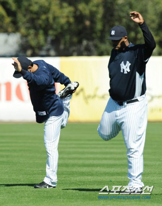 | 뉴욕 양키스 C.C. 사바시아가 조만간 무릎 수술을 받고 시즌을 접을 계획이다. 사진은 2010년 스프링캠프에서 박찬호(왼쪽)와 함께 몸을 풀고 있는 사바시아. 스포츠조선 DB |