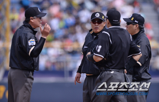 감독이 비디오 판독을 요청할 시간을 얼마로 규정하느냐는 매우 중요한 세칙 중 하나였다. 이걸 정해두지 않을 경우 마냥 시간이 늘어질 수 있을 위험이 컸다. 2014시즌부터 비디오 판독을 확대시행하고 있는 MLB는 경기 종료 아웃카운트나 공수 교대가 이뤄지는 3번째 아웃카운트에 대해선 판정 후 10초 이내로 제한을 두고 있다. KBO도 MLB 처럼 똑같이 이 경우는 10초 제한을 두기로 했다. 문제는 이닝 도중 발생할 수 있는 합의 판정의 경우였다. MLB는 이 경우 초 제한을 두지 않고 있다. KBO는 18일 감독 간담회를 갖고 이 경우 최초 심판 판정 후 30초 내로 신청을 제한하기로 확정했다. KBO 실무진이 30초 안을 제시했고, 감독들은 30초를 받아들였다. 11일 오후 창원 마산종합운동장 야구장에서에서 2014 프로야구 NC와 롯데의 경기가 열렸다. 3회초 1사 1,2루서 1루수자 박준서가 김문호의 내야 땅볼 때 2루에 뛰어들다 몸에 맞은 볼이 빠지면서 세이프 되었다. NC 김경문 감독이 박준서의 팔을 든 행동이 고의적이었다며 항의하자 심판들이 모여 회의하고 있다. 창원=김경민 기자 kyungmin@sportschosun.com / 2014.05.11.