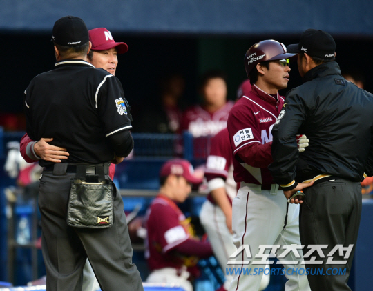 넥센 히어로즈와 두산 베어스의 2014프로야구 경기가 1일 잠실구장에서 열렸다. 1회초 2사 넥센 윤석민이 삼진아웃을 당한 가운데 덕아웃에서 볼판정에 불만을 나타내자 윤상원 주심과 이영재 3루심이 넥센 덕아웃으로 다가가 격앙된 반응을 보이고 있다. 넥센 이강철 수석코치와 최만호 3루코치가 심판들을 달래고 있다. 잠실=정재근기자 cjg@sportschosun.com/2014.05.01/