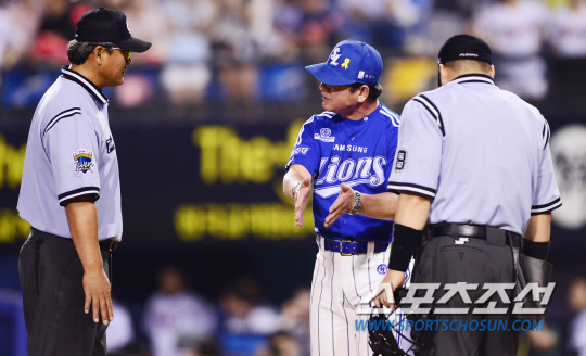 LG와 삼성의 전반기 마지막 경기가 16일 잠실 야구장에서 펼쳐 졌다. LG 6회말 2사 2,3루에서 3루주자 박경수가 홈스틸에 성공하자 삼성 류중일 감독이 나와 아웃이라며 심판진에 항의하고 있다. 잠실=조병관기자 rainmaker@sportschosun.com/2014.07.16/ |