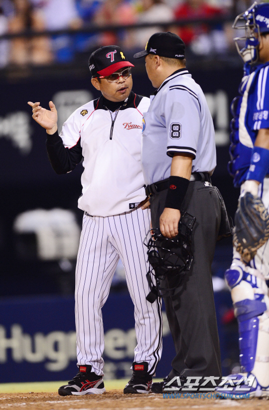 LG와 삼성의 전반기 마지막 경기가 16일 잠실 야구장에서 펼쳐 졌다. LG 4회말 2사 2,3루 찬스 오지환 타석때 양상문 감독이 나와 삼성 윤성환의 투구폼에 대해 어필을 하고 있다. 잠실=조병관기자 rainmaker@sportschosun.com/2014.07.16/