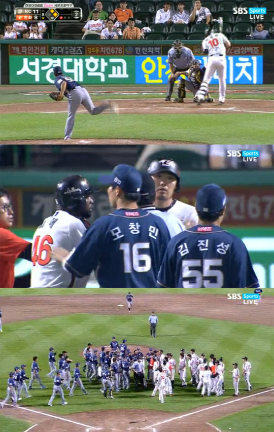 NC가 11대 8로 리드하던 8회말 1사 주자 1,2루 상황에서 NC 7번째 투수 김진성이 던진 볼이 한화 김태완 허리쪽을 향해 날아갔다. 이 공은 몸을 비틀며 피하던 김태완의 팔꿈치 보호대에 맞았다.