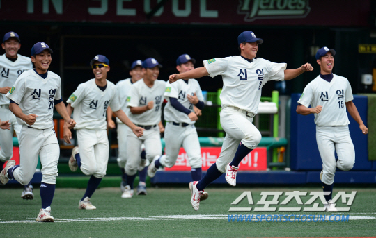 북일고와 신일고의 제69회 청룡기 전국고교야구선수권대회 겸 주말리그 왕중왕전 16강전 경기가 23일 우천으로 중단된 후 24일 목동구장에서 5회부터 재개됐다. 9회말 2사 2,3루 북일고 서지호를 2루수 땅볼로 잡으며 4-3의 승리를 지킨 신일고 선수들이 환호하고 있다. 목동=정재근 기자 cjg@sportschosun.com/2014.07.24/