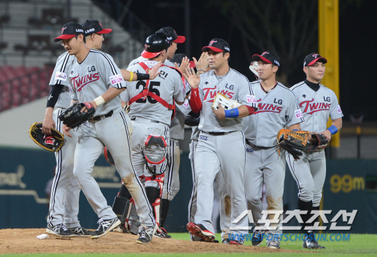 24일 오후 광주 기아챔피언스필드에서 2014 프로야구 LG와 KIA의 경기가 열렸다. 6대2로 승리한 LG 선수들이 마운드 위에서 하이파이브를 나누고 있다. 광주=김경민 기자 kyungmin@sportschosun.com / 2014.07.24. |