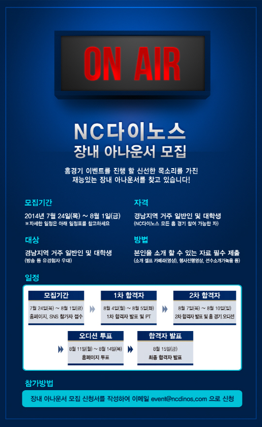 NC 다이노스가 홈경기 이벤트를 진행할 장내 아나운서를 모집한다.