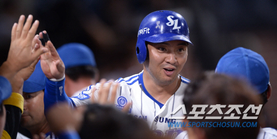 25일 오후 포항 종합운동장 야구장에서 2014 프로야구 NC와 삼성의 경기가 열렸다. 7회말 1사 2루서 2루주자 채태인이 이승엽의 1타점 적시타 때 득점을 한 후 동료들과 환하게 웃고 있다. 포항=김경민 기자 kyungmin@sportschosun.com / 2014.07.25.
