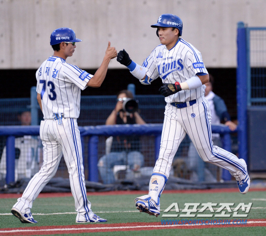 26일 오후 포항 종합운동장 야구장에서 2014 프로야구 NC와 삼성의 경기가 열렸다. 2회말 무사서 삼성 이승엽이 좌중월 솔로홈런을 친 후 김재걸 코치와 하이파이브를 나누고 있다. 포항=김경민 기자 kyungmin@sportschosun.com / 2014.07.26.