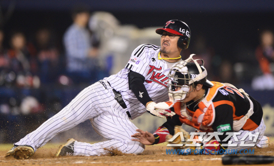 26일 잠실구장에서 프로야구 LG와 롯데의 주말 3연전 두 번째 경기가 열렸다. LG 8회말 1사 1,2루에서 박용택의 적시타 때 2루주자 정성훈이 득점에 성공했다. 홈에서 롯데 용덕한의 블로킹을 피해 세이프 되고 있는 정성훈. 잠실=송정헌 기자 songs@sportschosun.com/2014.07.26