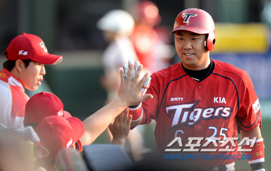넥센과 KIA의 주말 3연전 마지막 경기가 6일 목동구장에서 열렸다. 3회초 1사 KIA 이범호가 넥센 김대우의 투구를 받아쳐 좌측담장을 넘어가는 솔로홈런을 날렸다. 홈인하며 기쁨을 나누는 이범호. 목동=허상욱 기자 wook@sportschosun.com/2014.07.06/ |