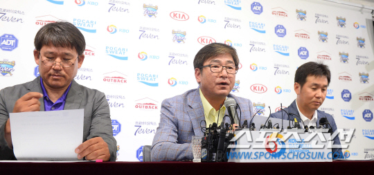 류중일 감독이 조계현, 유지현 코치와 28일 오후 도곡동 야구회관에서 2014 아시안게임 야구대표팀 최종엔트리 명단을 발표하고 있다. "소속팀에 대한 안배없이 금메달을 딸 수 있는 선수로 뽑았다"고 밝힌 류중일 감독은 우선 투수로는 안지만 차우찬 임창용 유원상 봉중근 한현희 김광현 이재학 양현종 이태양 홍성무를 선발했다. 내야수로는 박병호 오재원 김민성 황재균 김상수 강정호, 외야수로는 김현수 민병헌 손아섭 나성범 나지완 포수는 강민호 이재원이 선발했다 도곡동=최문영 기자 deer@sportschosun.com /2014.07.28/