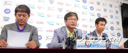 류중일 감독이 조계현, 유지현 코치와 28일 오후 도곡동 야구회관에서 2014 아시안게임 야구대표팀 최종엔트리 명단을 발표하고 있다. "소속팀에 대한 안배없이 금메달을 딸 수 있는 선수로 뽑았다"고 밝힌 류중일 감독은 우선 투수로는 안지만 차우찬 임창용 유원상 봉중근 한현희 김광현 이재학 양현종 이태양 홍성무를 선발했다. 내야수로는 박병호 오재원 김민성 황재균 김상수 강정호, 외야수로는 김현수 민병헌 손아섭 나성범 나지완 포수는 강민호 이재원이 선발했다 도곡동=최문영 기자 deer@sportschosun.com /2014.07.28/ |